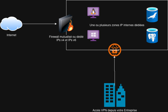 Exemple sur le schéma suivant avec un firewall dédié, un ou plusieurs services opérés dans un espace réseau dédié, un accès par VPN: